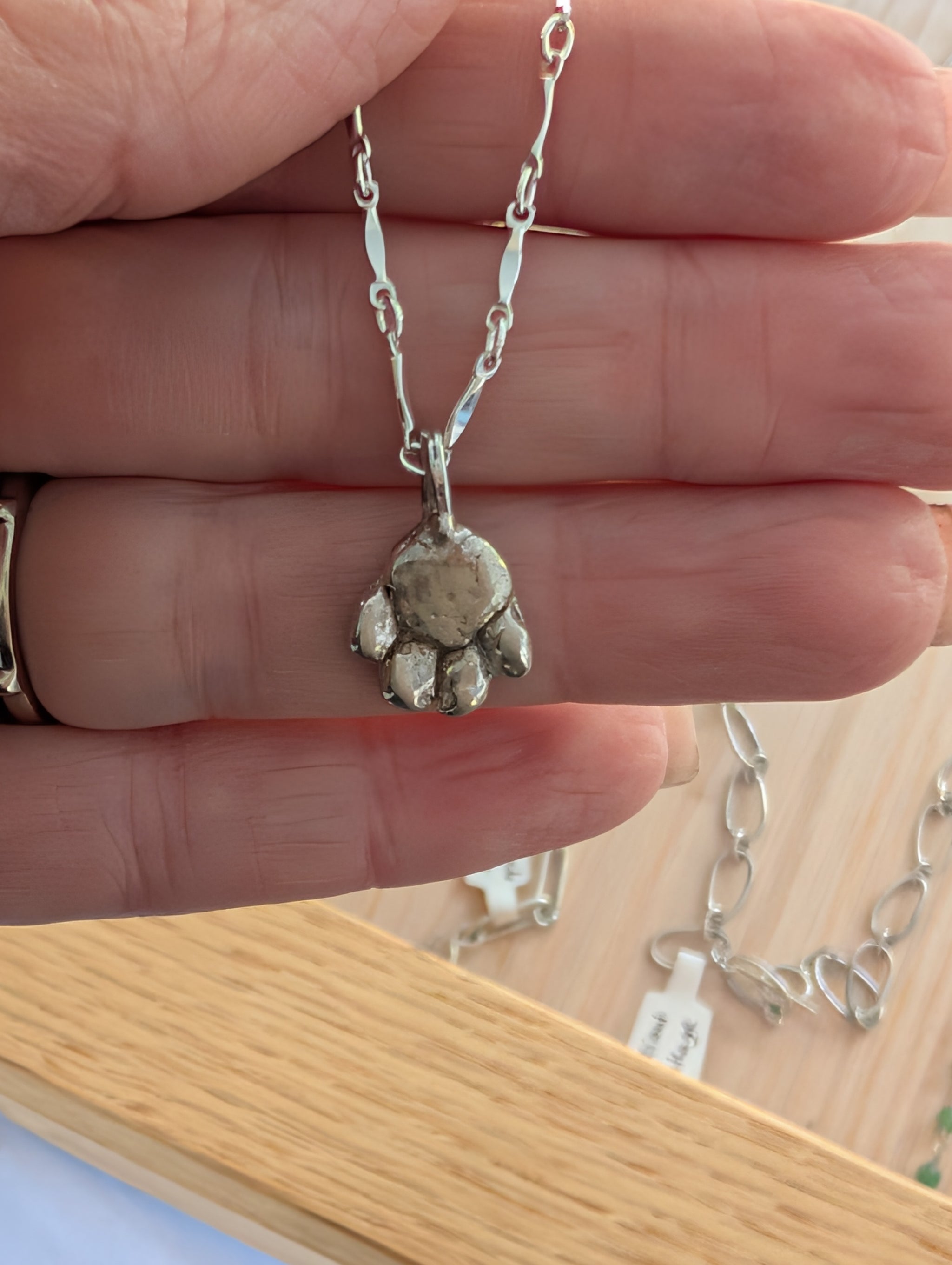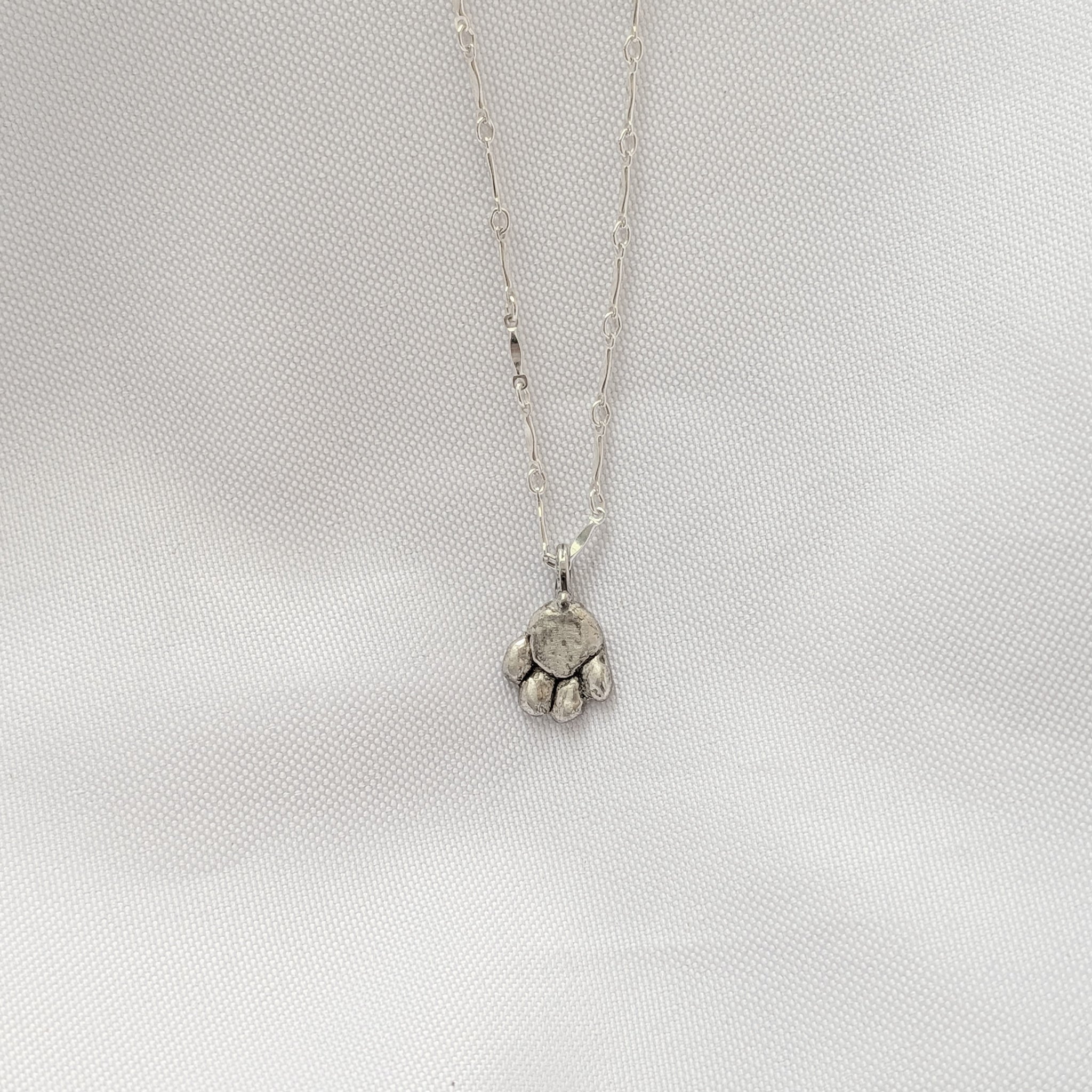 Cast in solid sterling silver using traditional lost wax methods, this pendant features a beautifully organic paw shape with a slightly raw, textured finish. It's not just a symbol — it’s a story. The listing photo shows the exact paw print necklace available for purchase, cast from a real paw impression. But if you’d prefer a personal touch, you can commission a custom version made from your own pet’s paw print, available in sterling silver or 18K gold.