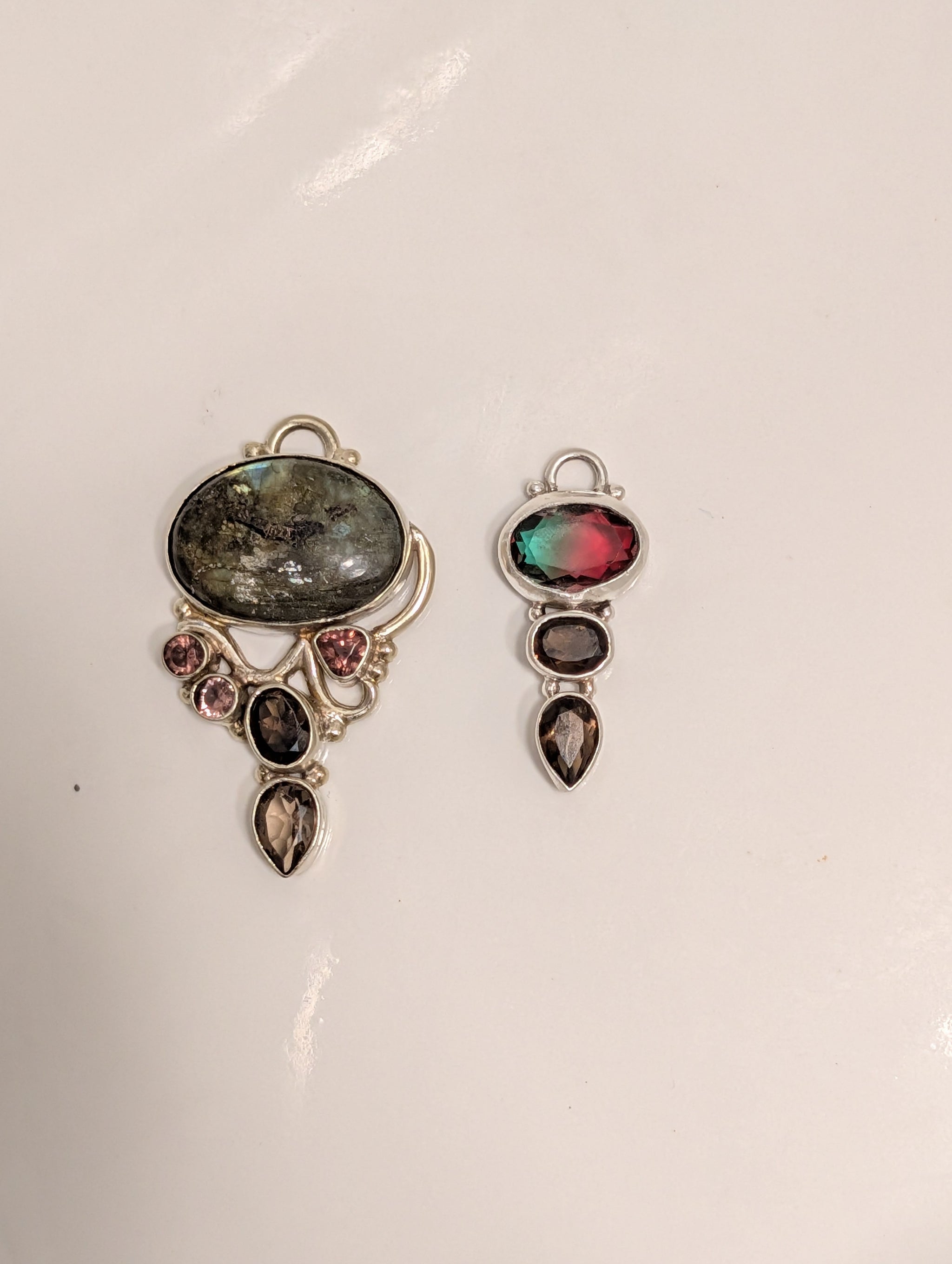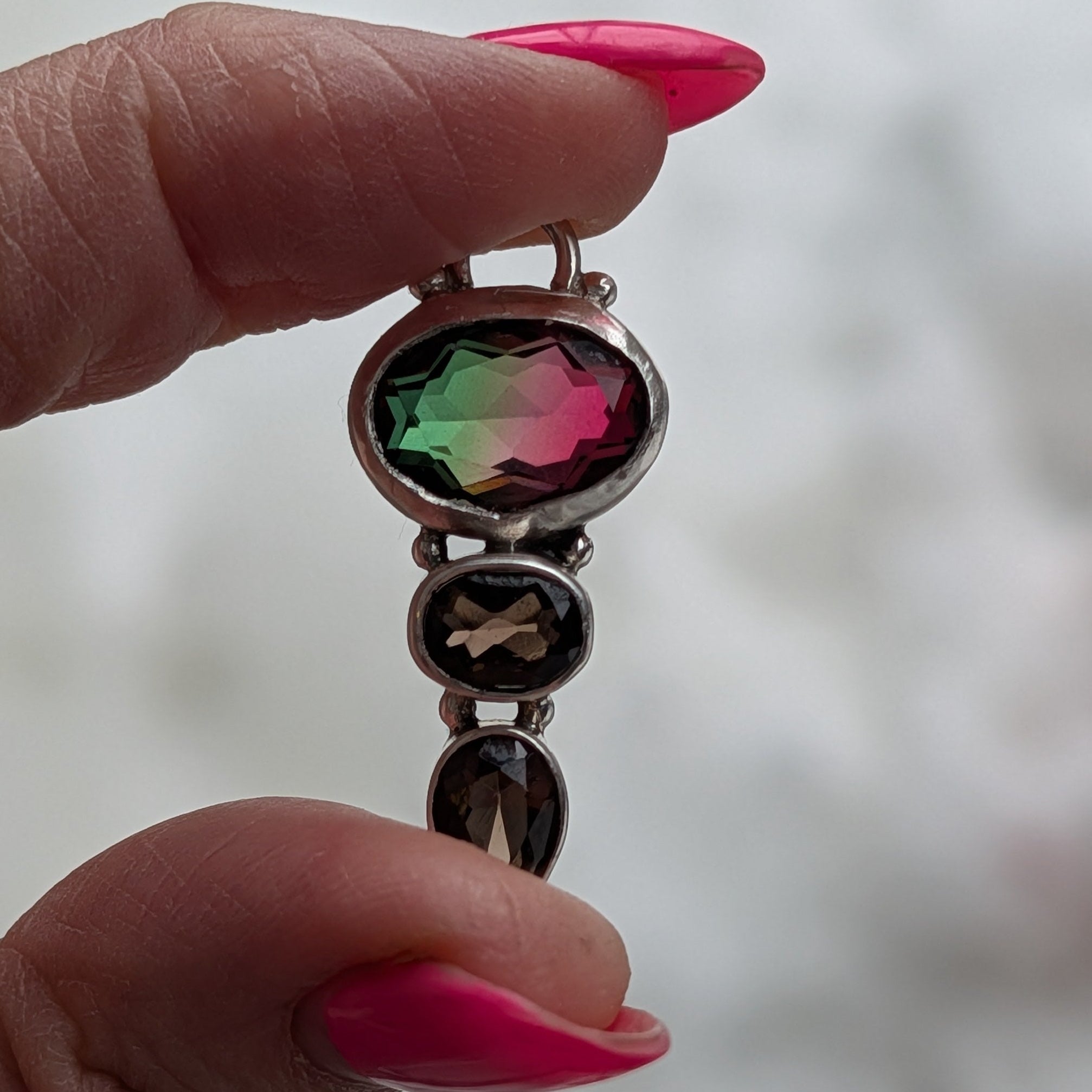 This one-of-a-kind pendant features a faceted watermelon tourmaline set in sterling silver, paired with two faceted smoky quartz stones below.