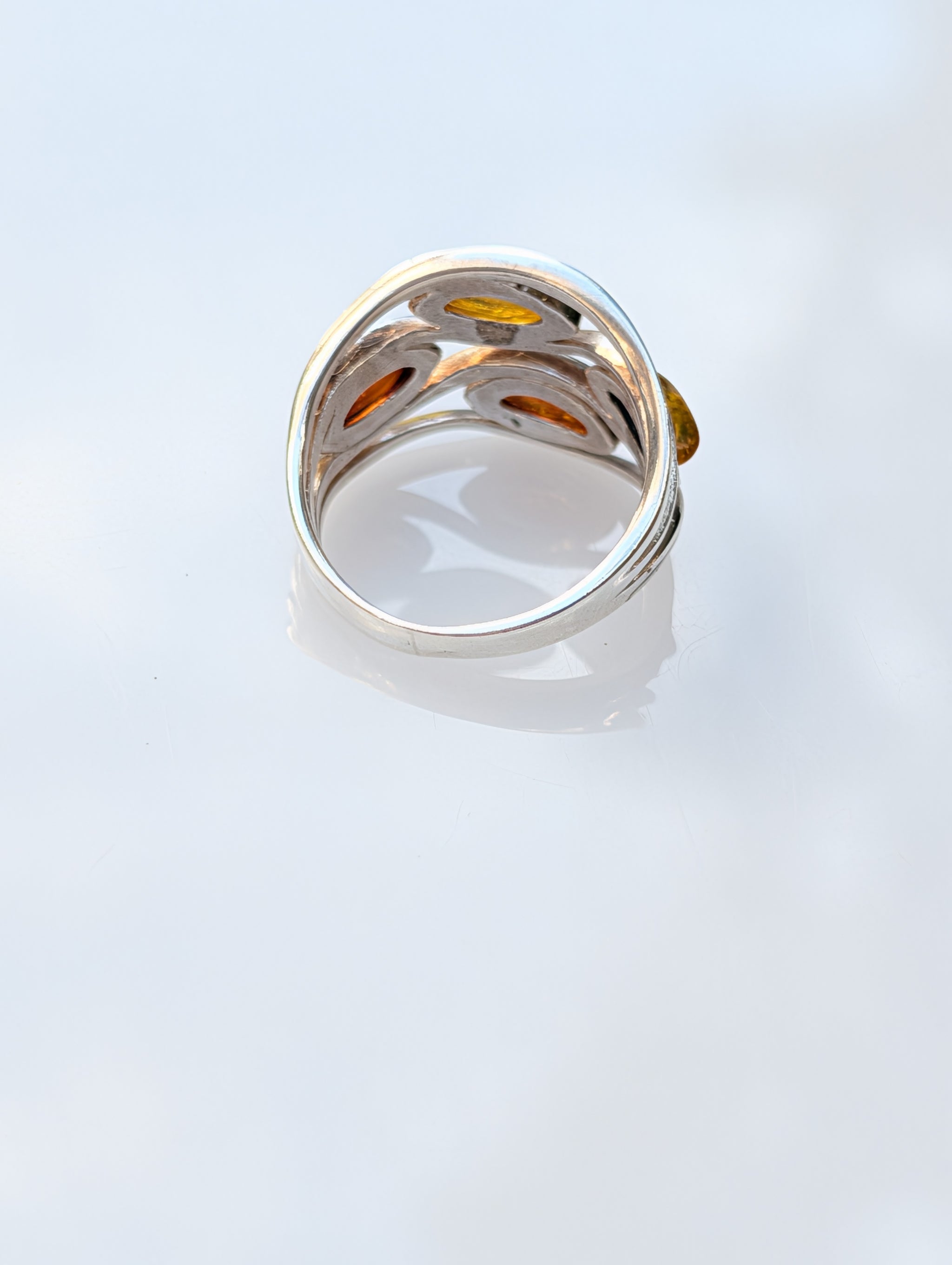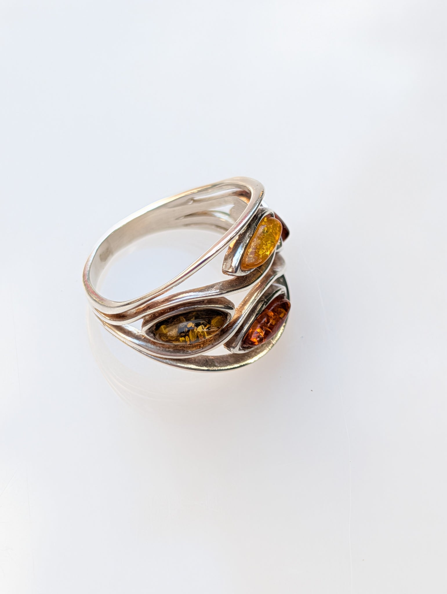 Handcrafted in sterling silver, its graceful curves wrap around the finger, holding three marquise-cut Baltic amber stones in golden and honey tones. The design flows effortlessly, reflecting the natural movement of light and air. Each stone glows with a soft inner fire, shifting in depth and hue as the light changes.