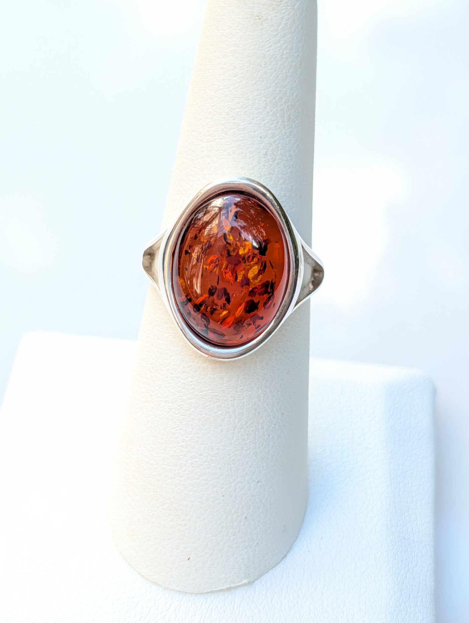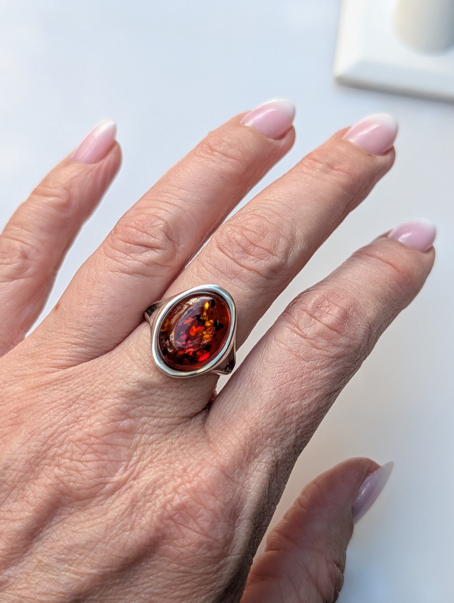 Handcrafted in sterling silver, this one-of-a-kind ring features an oval Baltic amber gem, rich with golden and cognac tones that seem to shift with every movement. Its smooth, sculptural bezel cradles the stone like a vessel for light — elegant, balanced, and eternal.