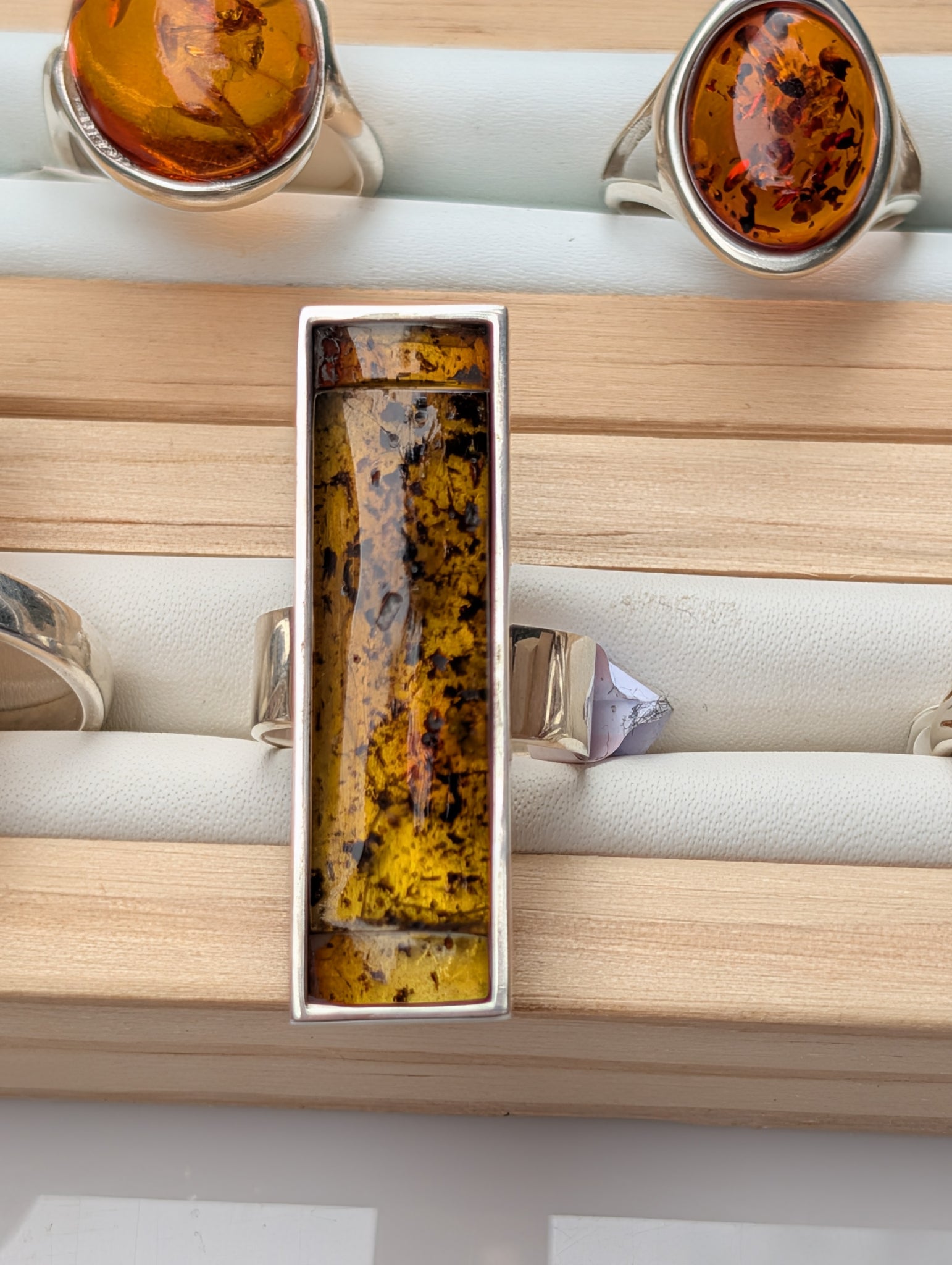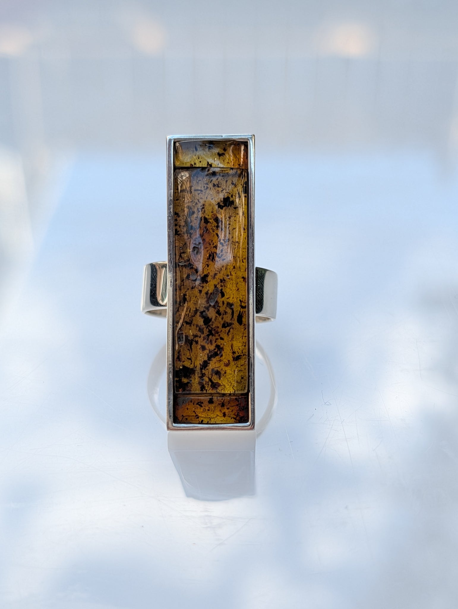 Handcrafted in sterling silver, this statement ring features a long rectangular green Baltic amber — a rare and natural gem that holds both light and shadow within it. The open, slightly adjustable flat band offers comfort and strength, making this piece as wearable as it is bold.
