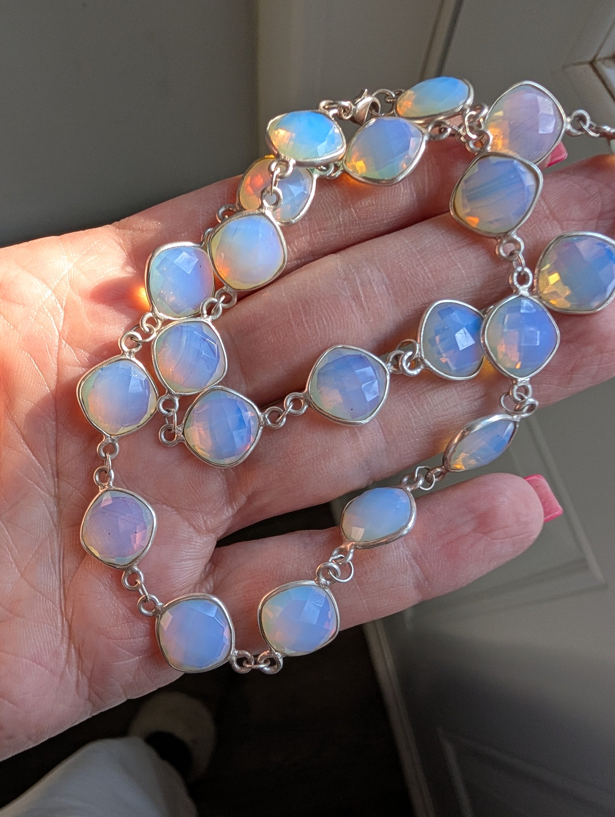 With its soft blue-white iridescence and subtle flashes of rainbow fire, opalite evokes clarity, emotional balance, and the quiet confidence of still waters. Lightweight yet striking, this necklace is a graceful complement to silk blouses, open collars, or eveningwear.