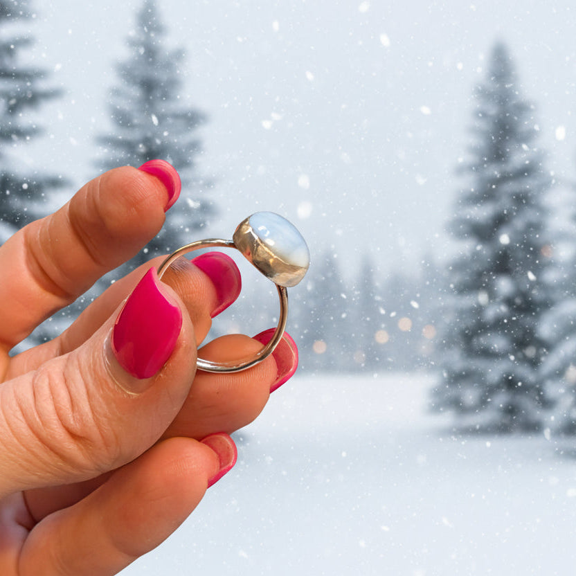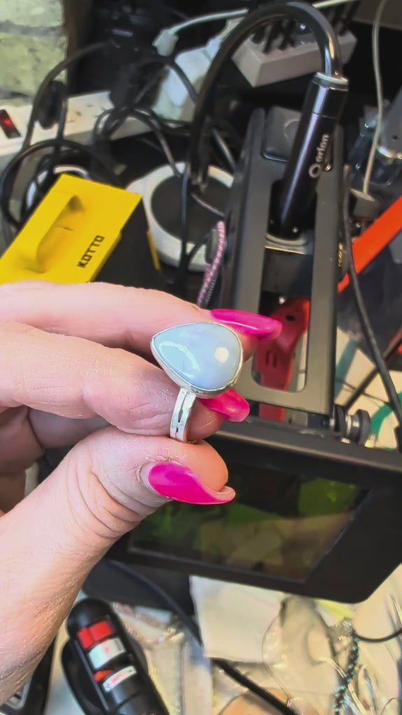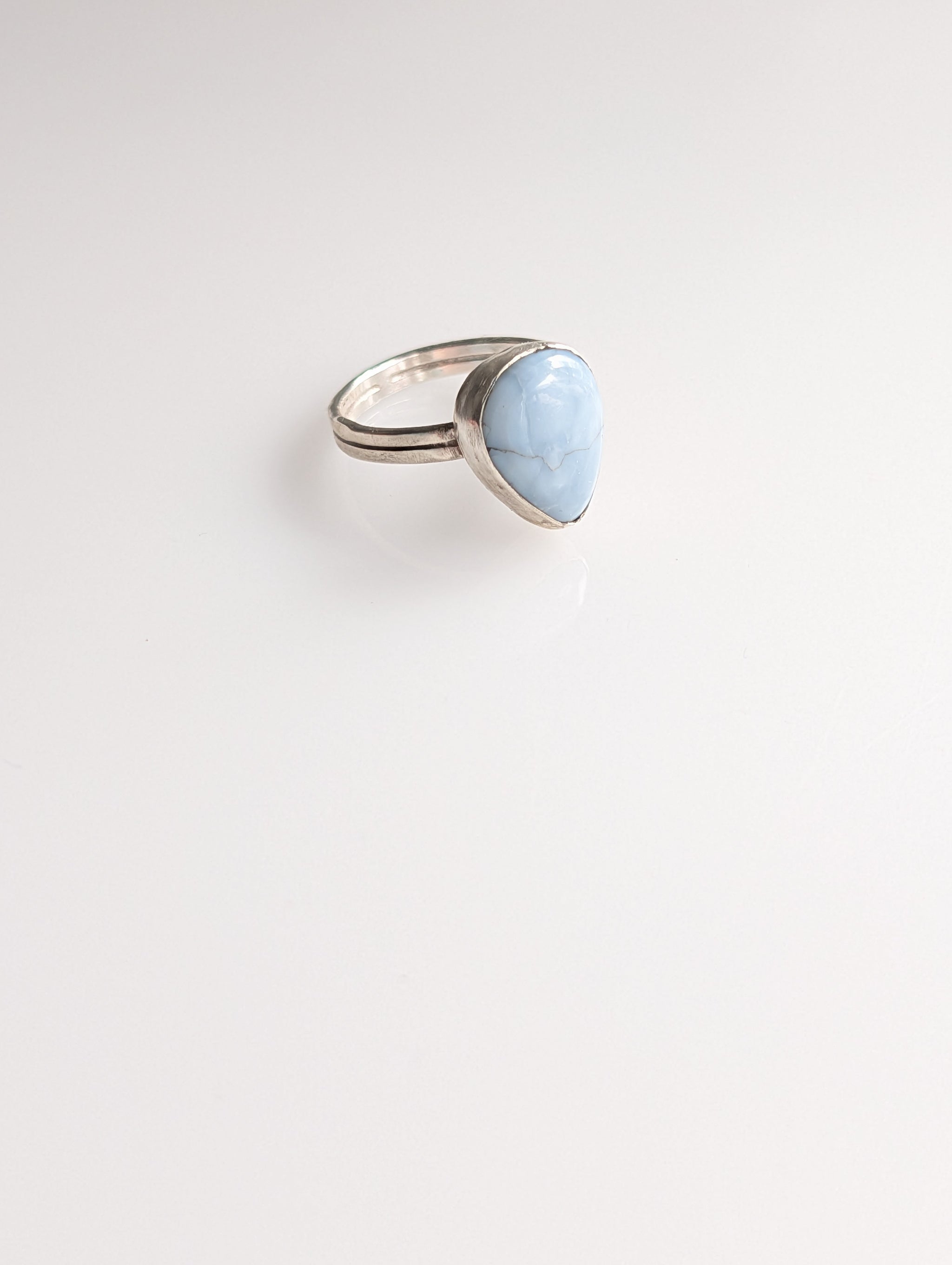 This handcrafted ring features a natural blue opal set in a handmade sterling silver bezel. The stone’s soft gradients of pale blue and white echo the sea at dusk, while subtle natural inclusions make each piece entirely its own. A gently hammered double-band shank designed for comfort and daily wear.