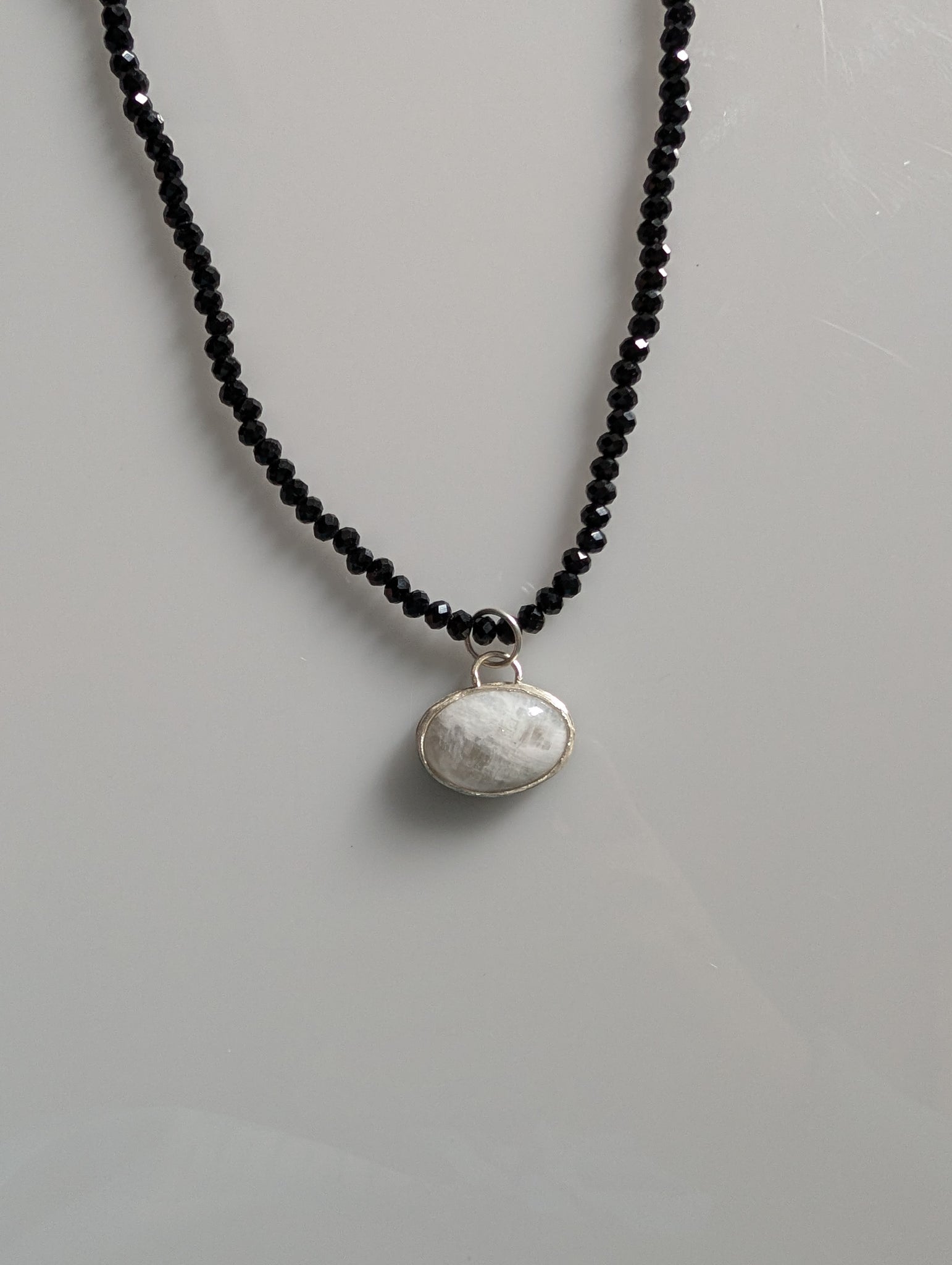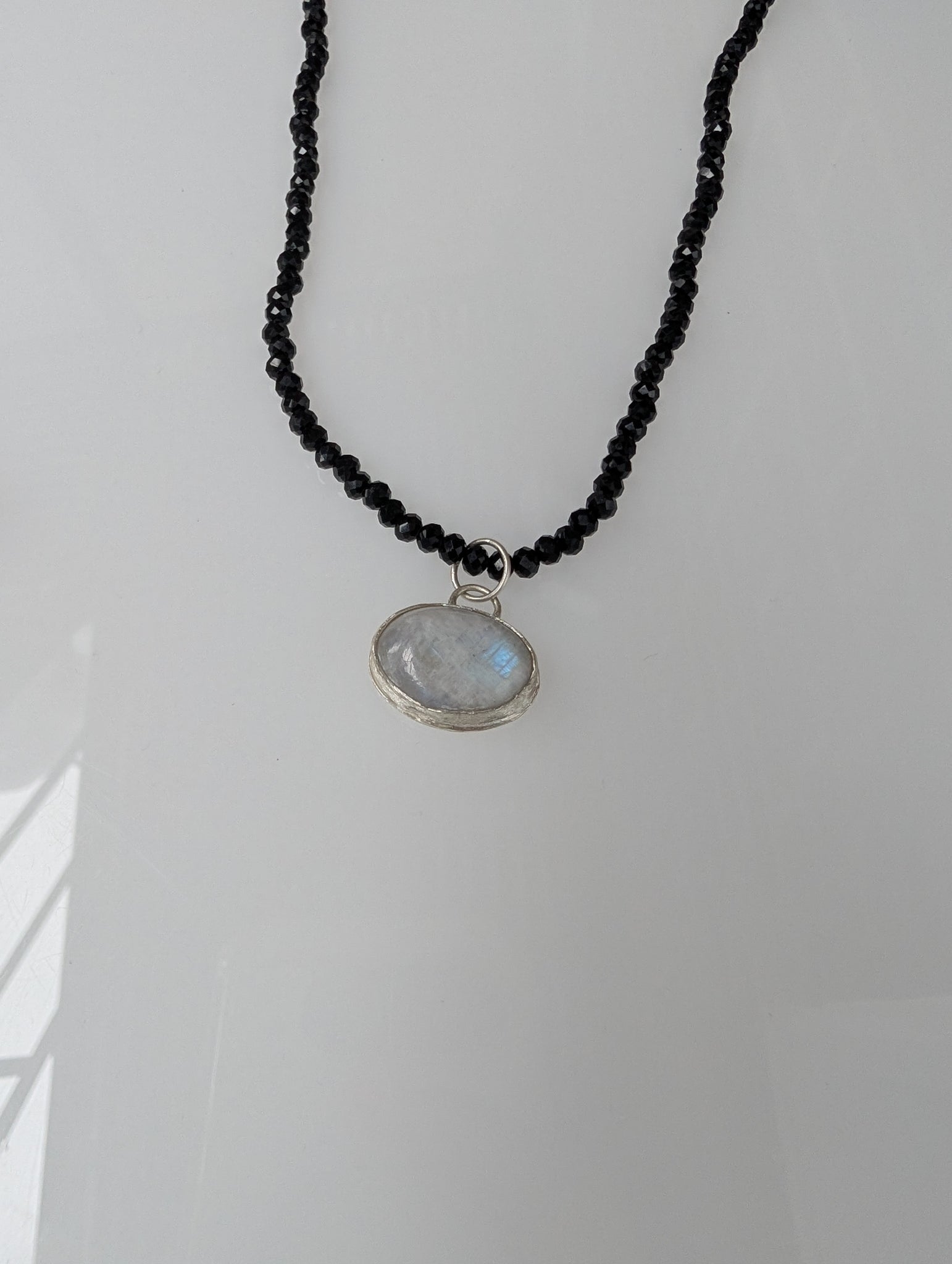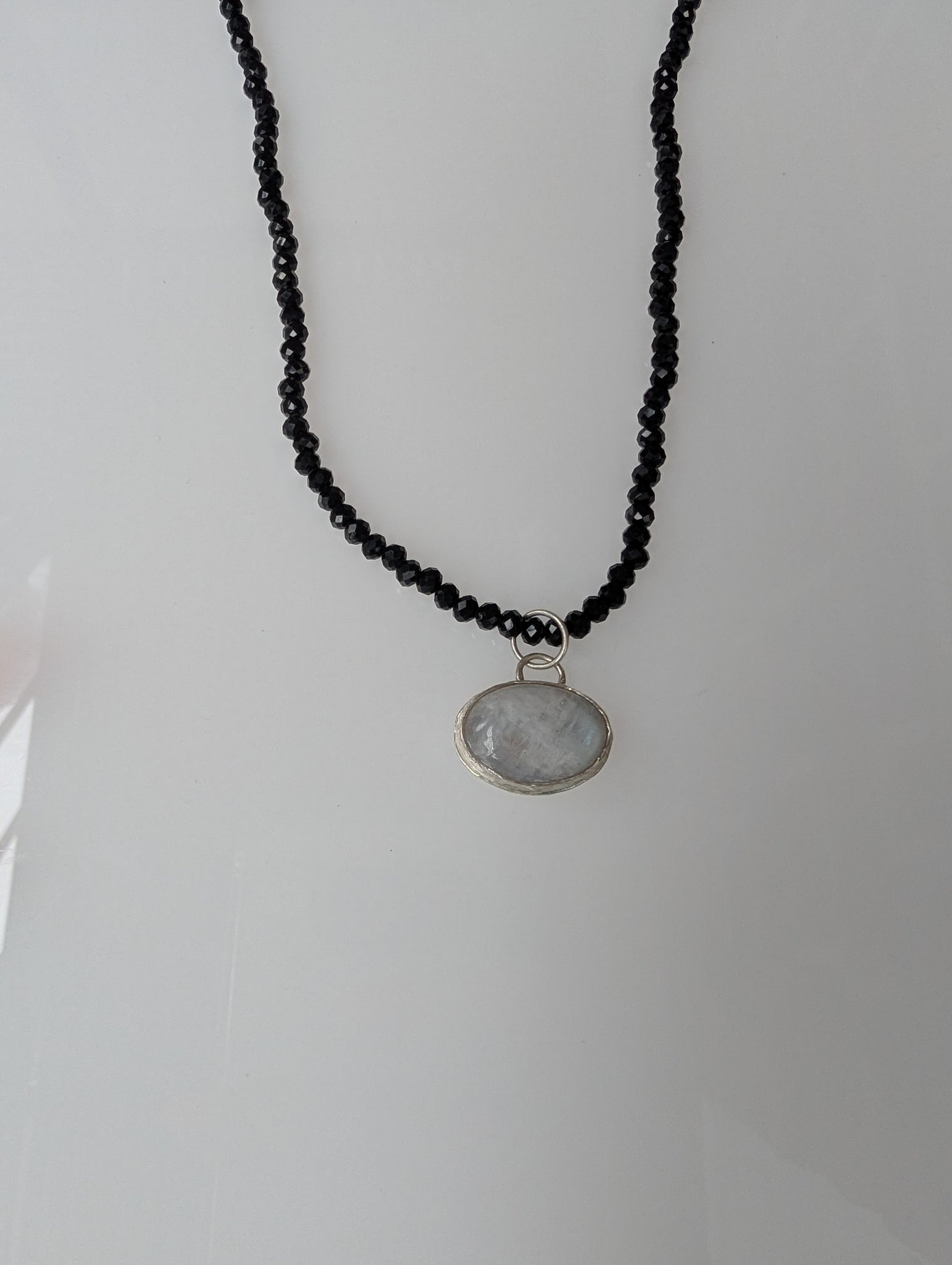 This sterling silver necklace features a natural moonstone set in a hand-formed bezel and suspended from a strand of faceted black beads. Soft, luminous, and magnetic, the moonstone glows with an inner light — the kind that reveals itself slowly, depending on movement and mood.