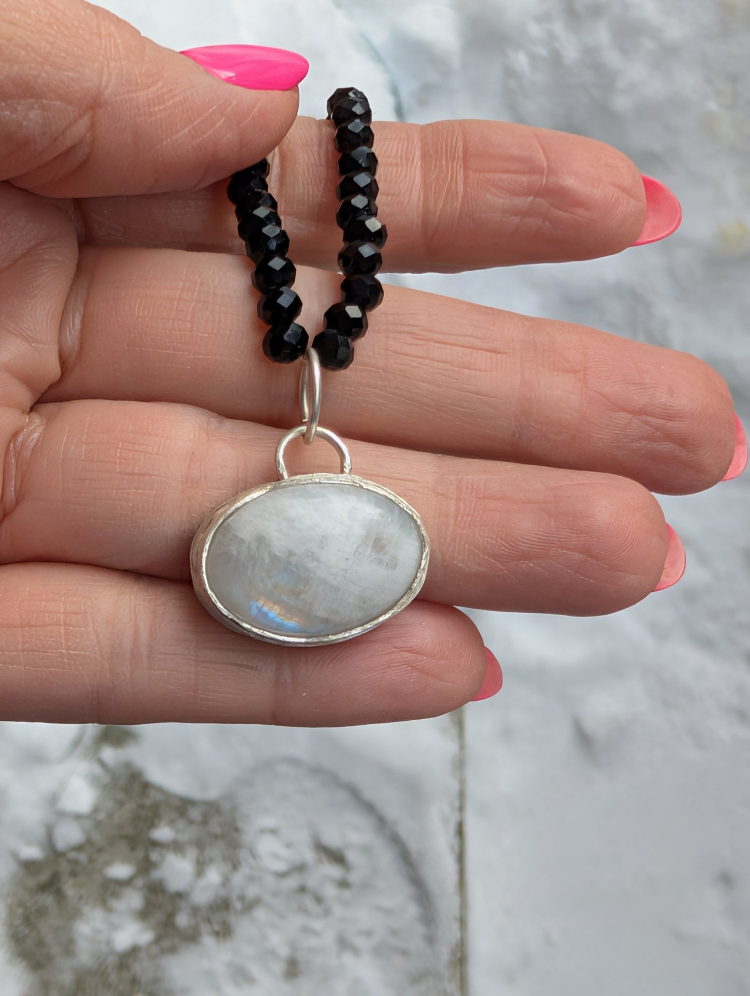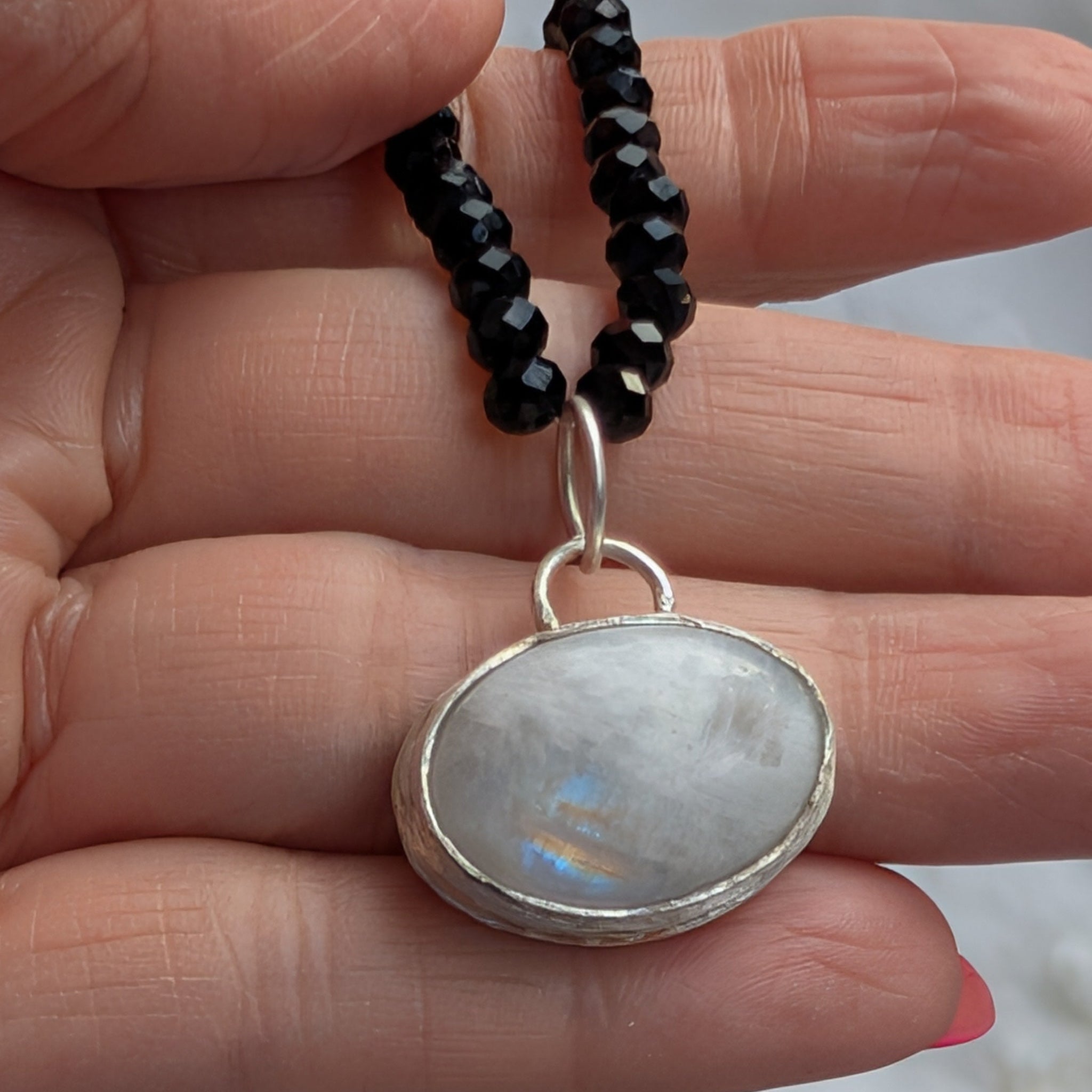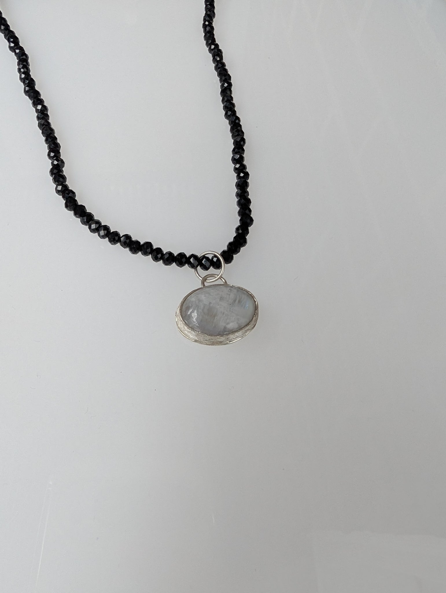 This sterling silver necklace features a natural moonstone set in a hand-formed bezel and suspended from a strand of faceted black beads. Soft, luminous, and magnetic, the moonstone glows with an inner light — the kind that reveals itself slowly, depending on movement and mood.