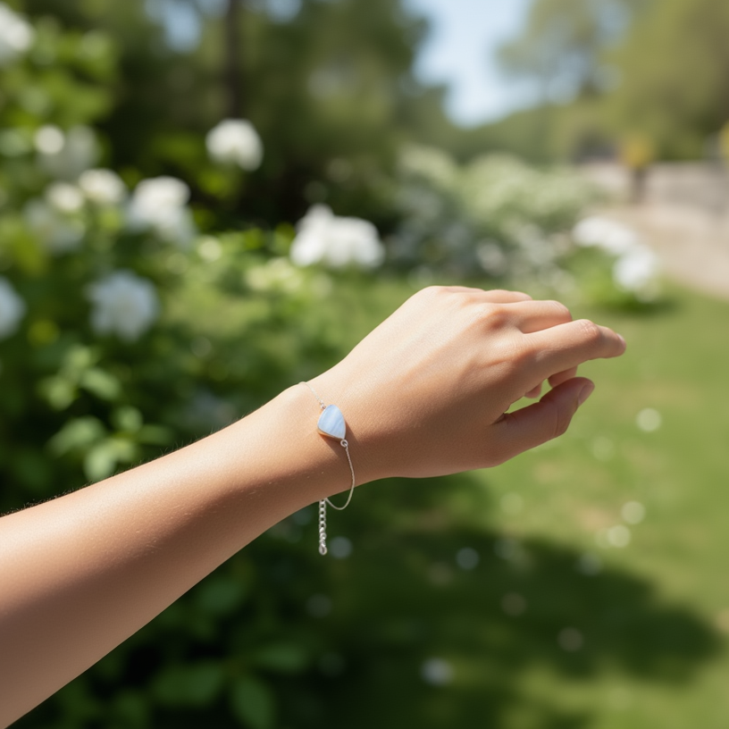 The stone is hand-set in an Argentium silver bezel, chosen for its brighter finish, increased durability, and superior tarnish resistance compared to traditional sterling silver. The fan shape creates a gentle sense of expansion, giving the bracelet presence without weight.
