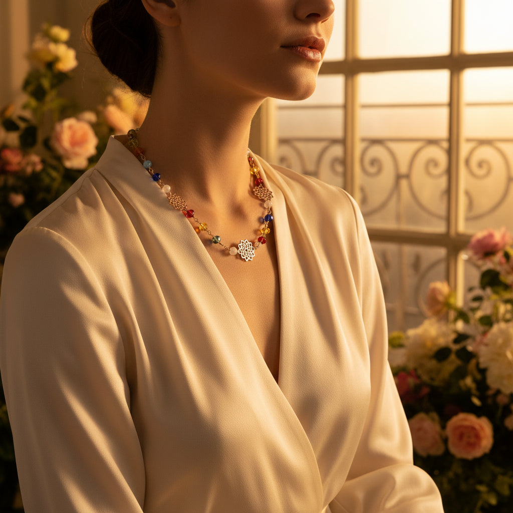 Mandala forms have long symbolized wholeness and inner alignment — a fitting complement to the soft spectrum of colour running through this design. The result is a necklace that feels intentional yet effortless, meaningful without being overstated.
