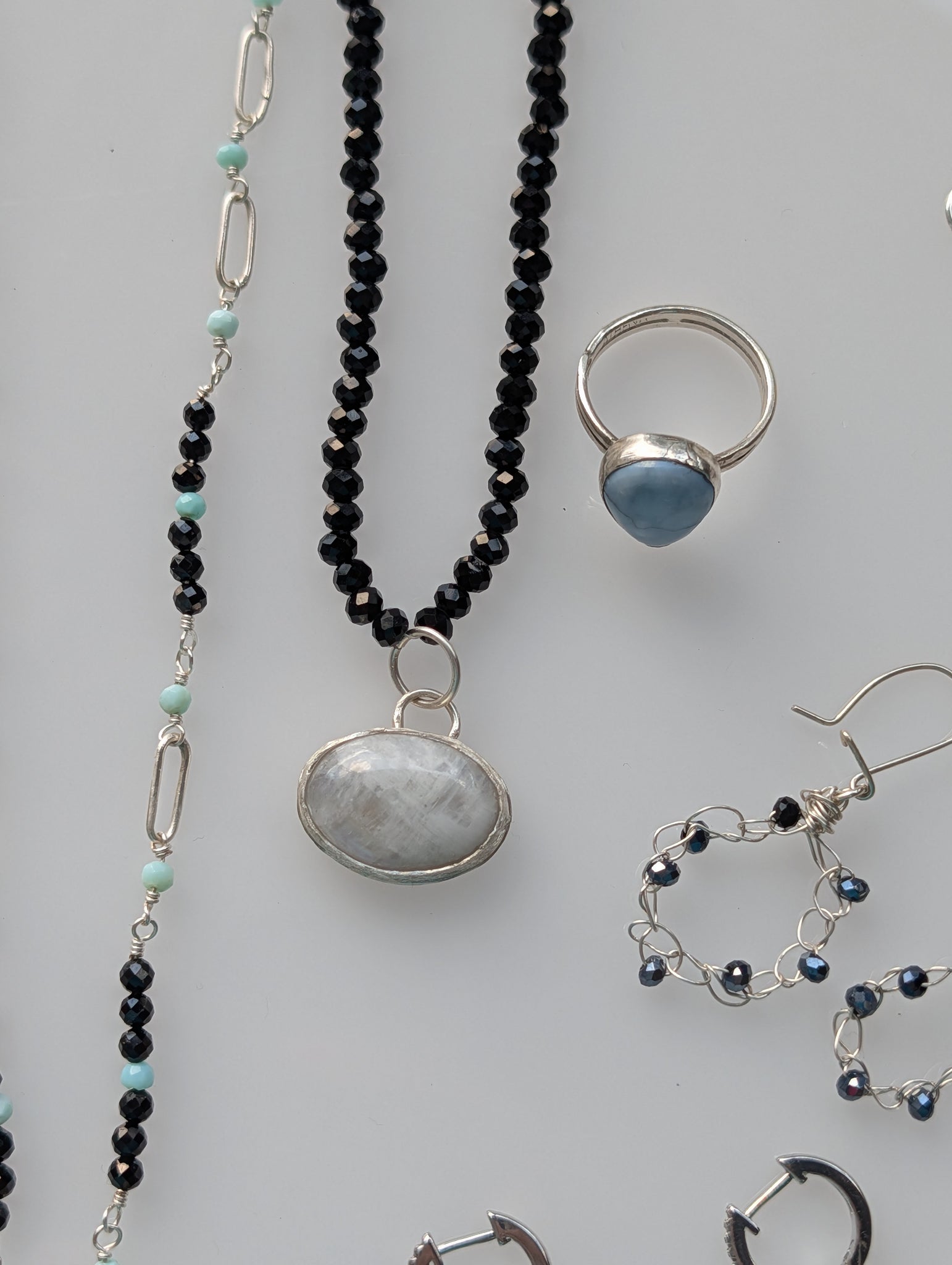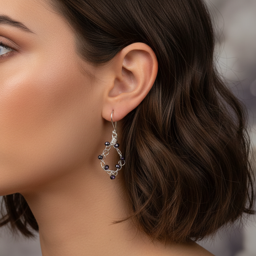The Abyss Oval Earrings are shaped with intention — elongated, continuous, and grounded. Each open oval is hand-crocheted in Argentium silver wire, a premium silver alloy chosen for its brightness, and resistance to tarnish. Black faceted beads are worked directly into the structure, creating a measured rhythm of shadow against silver.