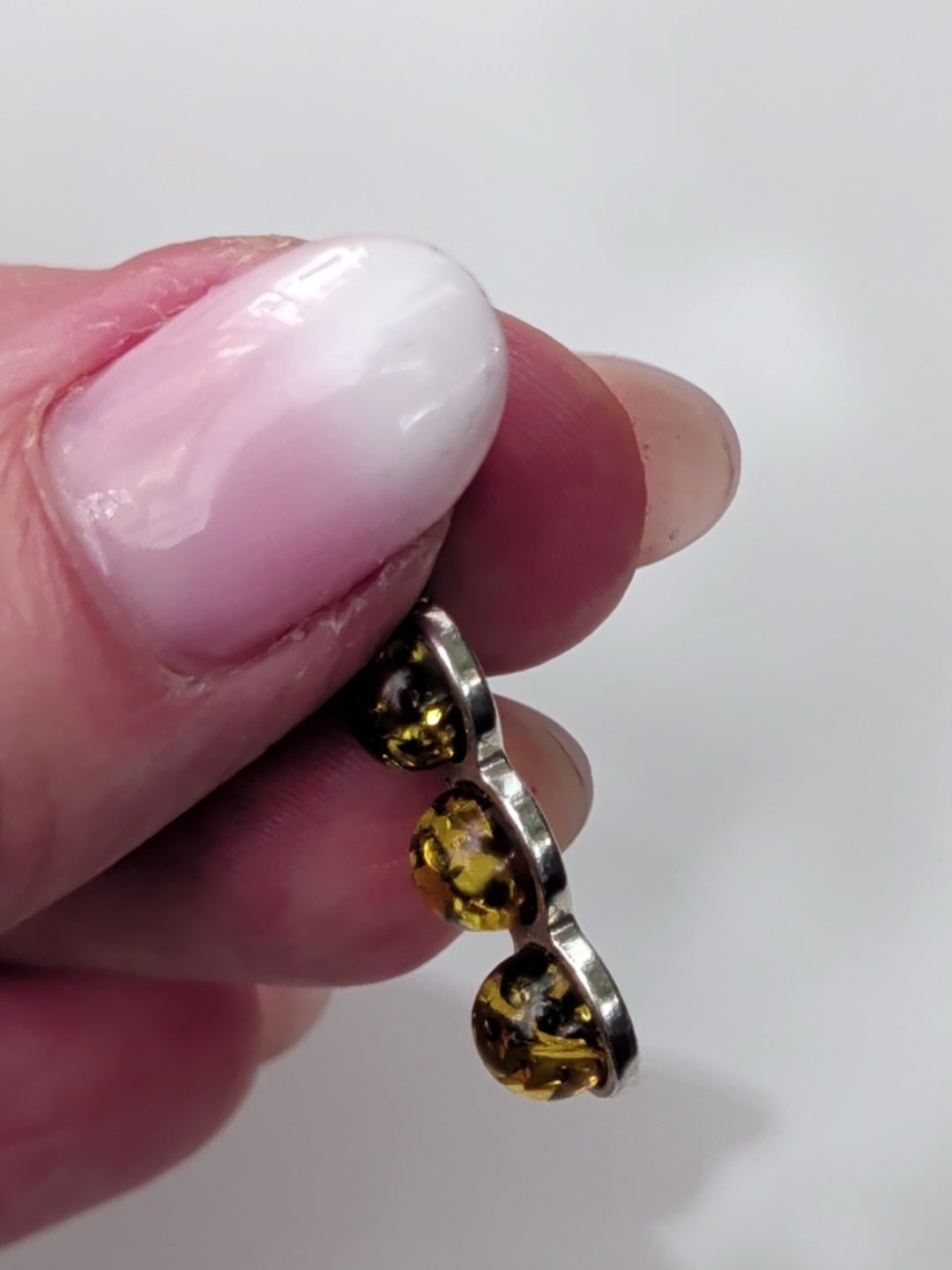 Handcrafted in sterling silver, this pendant features three round green Baltic amber gems arranged in a vertical alignment. Each stone shimmers with hints of gold and moss, creating a soft transition of color that feels alive in natural light. The simple design draws the eye along the line of light — graceful, modern, and deeply organic.